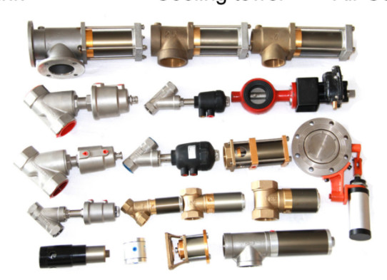 수압 및 공기 부품: 밸브, 액추에이터 및 튜브.